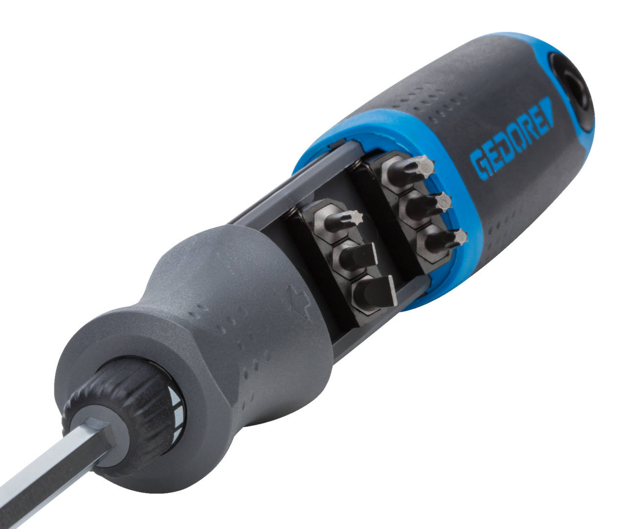 Rotating ring for clockwise/anticlockwise rotation adjustment, screw tightening also without ratchet function thanks to neutral central position with ratchet lock